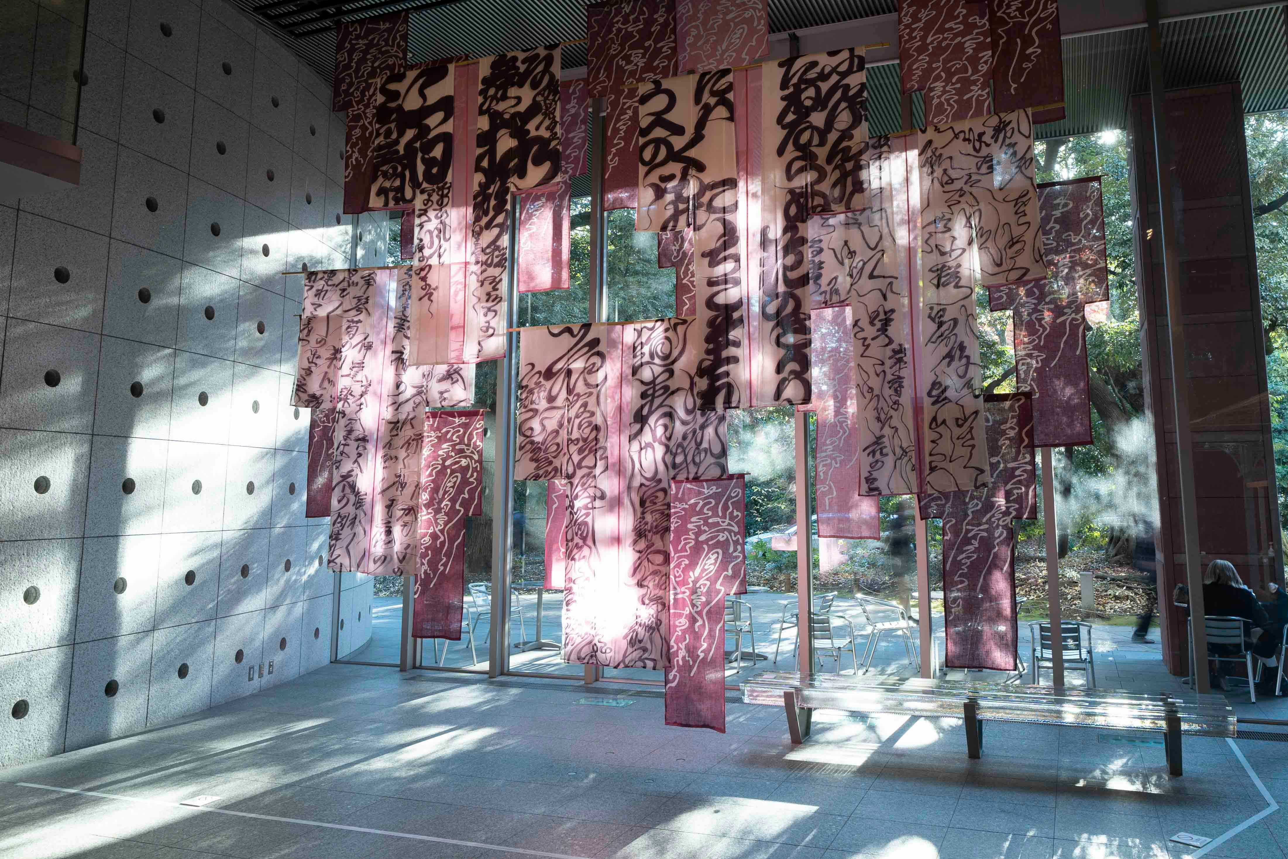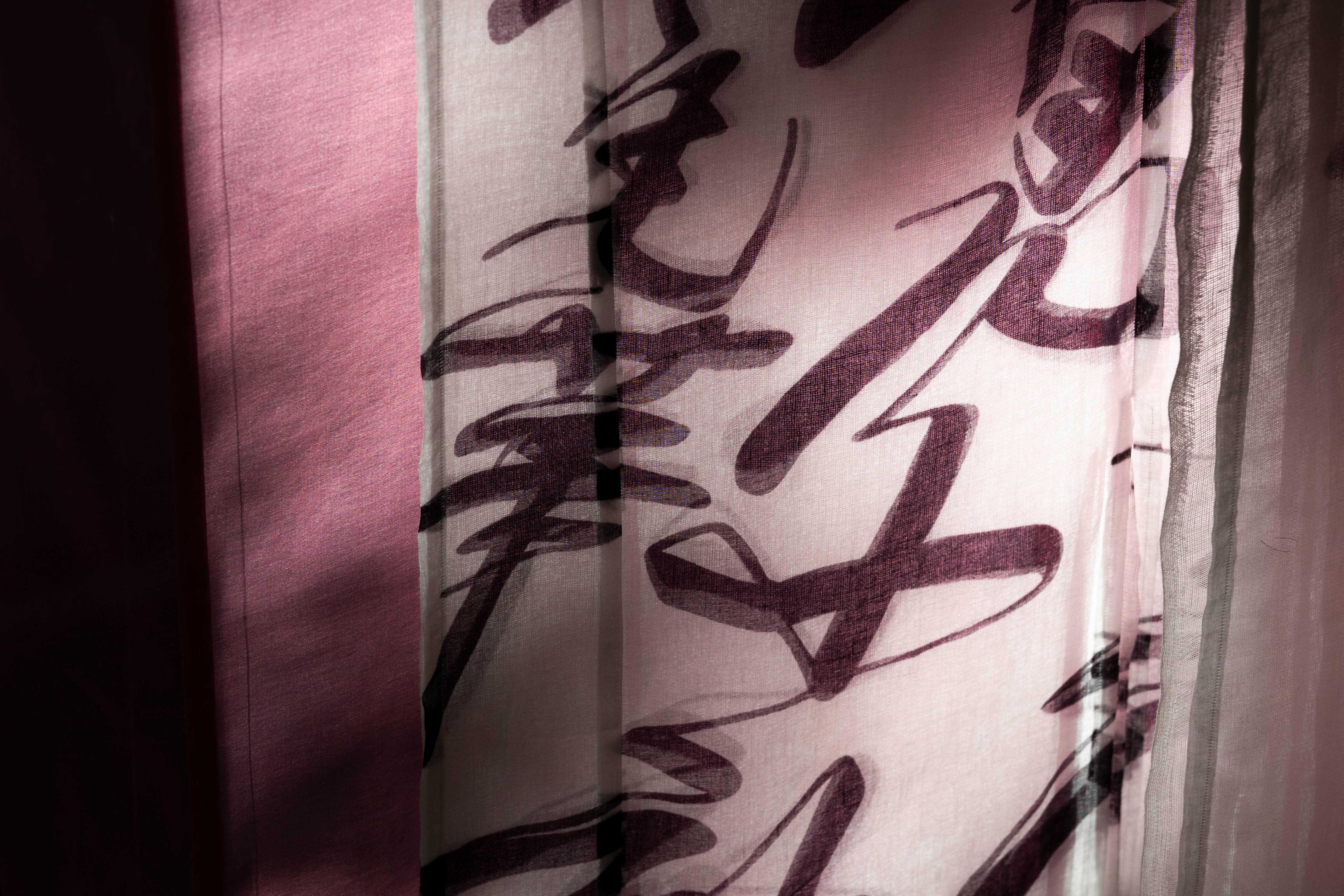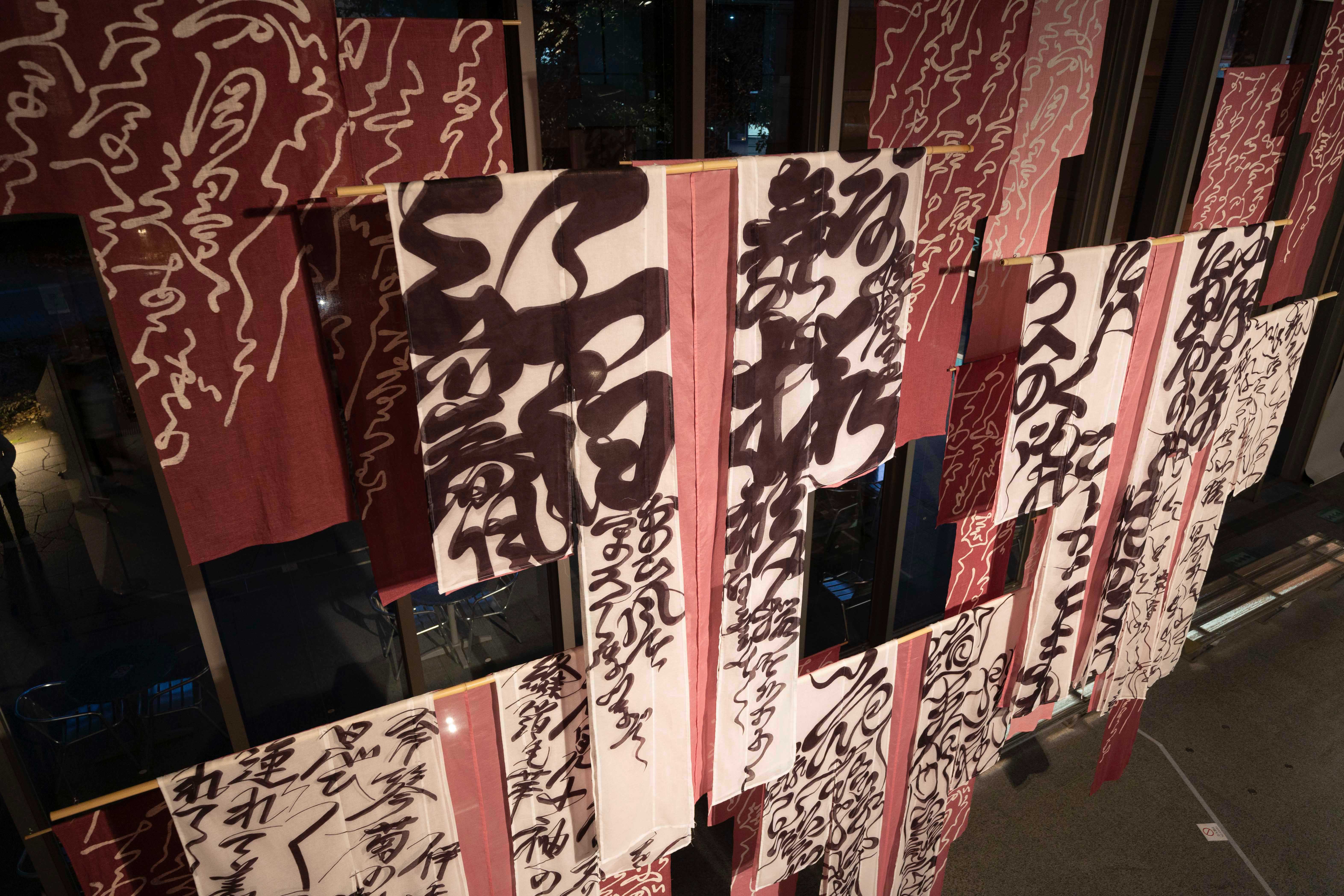 この作品は、浮かれの聖地たるこの土地で偶然にも行われる展覧会に向けて制作した、小袖幕の表象に浮かれと騒乱の連想を重ねたものである。江戸から明治にさまざまな形で記述された上野の浮かれの情景をテクストとし、反故染模様としてマッシュアップし、その背後に佇む現代の上野の景色に透かし合わせた。